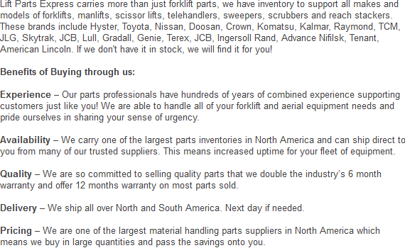 For your entire fleet of forklifts, we offer the best prices on all our parts. Call today to get a price quote on one of the parts or attachments we offer. Call us at: